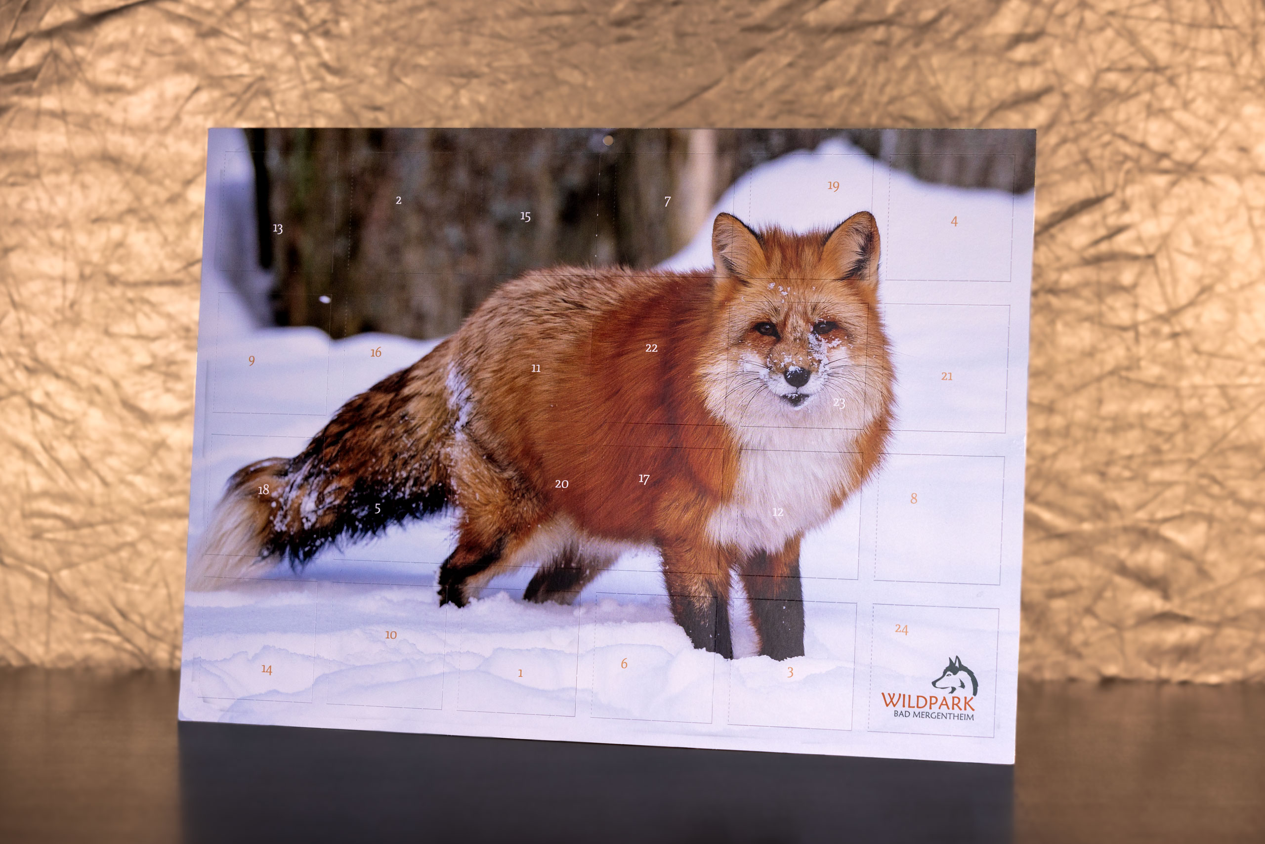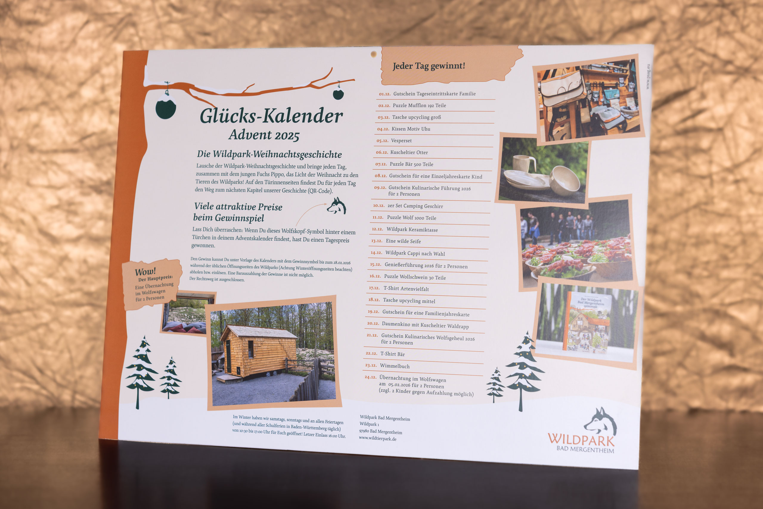 Hinter den Türchen warten viele attraktive Gewinne, z. B. Wildpark-Genießer-Führungen, Camping-Geschirr-Sets, T-Shirts, Puzzles, Taschen, Wimmelbücher, Gutscheine, uvm.