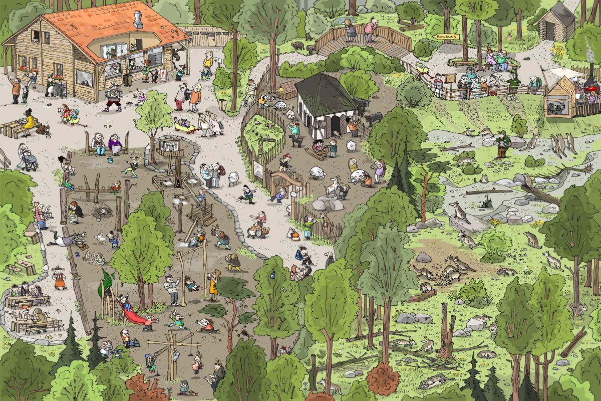 Dieses Wimmelbuch entführt Euch zu einem abenteuerlichen und fast detailgetreuen Besuch in den Wildpark Bad Mergentheim. Ihr erlebt allerlei Komisches, entdeckt versteckte Winkel und lernt den Park auf eine lustige Weise kennen. Die Schadenfreude darf an manchen Stellen natürlich nicht fehlen – Lachen ist gesund! 😉